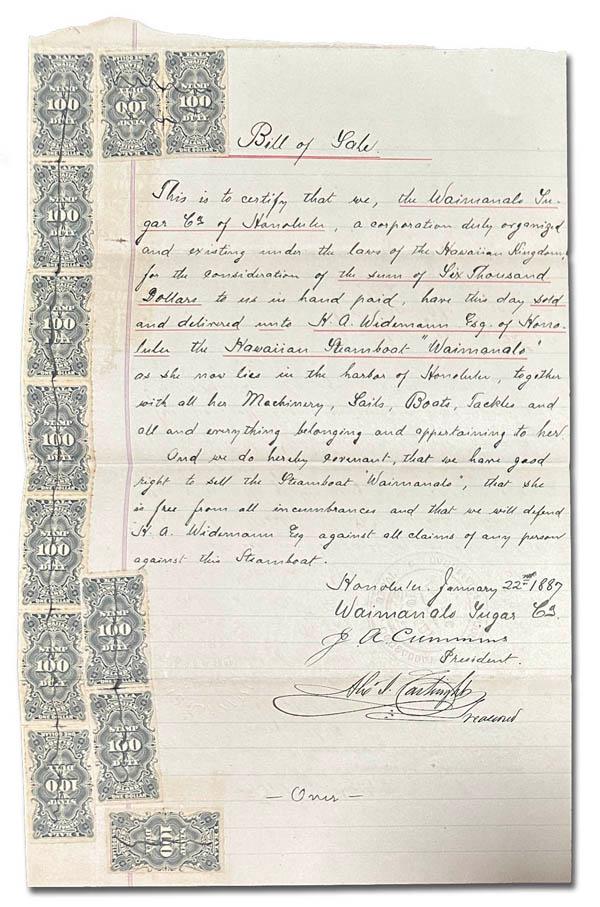 Hawaii, 1887, Notarized Bill of Sale, for a steamboat "as she lies in the harbor of Honolulu" for the sum of $6,000 with 12 canceled Sc. #R3's. Estimate $600 - 800. Suggested Bid $600-800 (Image)