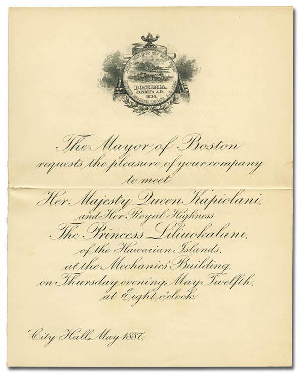 Hawaii, 1887, a printed invitation from the mayor of Boston, to meet Hawaiian Queen Kapiolani and Princess Liliuokalani, folded, with matching unused envelope, which also has the elaborate seal of Boston on the reverse. An interesting memento of historic value, Fine to Very Fine. Estimate $200 - 300. Suggested Bid $200-300 (Image)