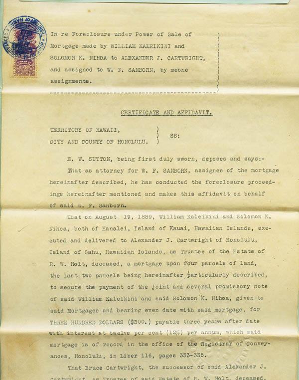 Hawaii, 1913, Real Estate Deed, bearing "Territory of Hawaii / Not Liable To Duty" revenue stamp (Meyer-Harris 463). The 5-page document is neatly typewritten and bears a notary seal at the end, Fine to Very Fine. Estimate $200 - 300. Suggested Bid $200-300 (Image)