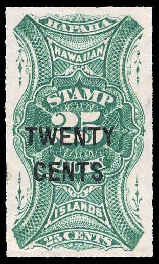 Hawaii, Revenue, 1893-94, 20¢ on 25¢ green (Scott R7), o.g., never hinged, Extremely Fine. Scott $80. Estimate $50 - 75. Scott $80 Suggested Bid $50-75 (Image)