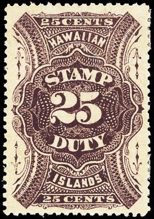 Hawaii, Revenue, 1894, 25¢ violet brown (Scott R10), beautifully well centered, unused without gum; small thin, Extremely Fine appearance, with photocopy of 2005 P.F. certificate for block. Scott $1,300 for o.g. Estimate $250 - 350. Scott $1,300 for o.g. Suggested Bid $250-350 (Image)