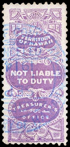 Hawaii, Revenue, 1901-10, "Territory of Hawaii / Not Liable To Duty" (Meyer-Harris 463), lightly canceled, Fine to Very Fine, a scarce stamp. Estimate $150 - 200. Suggested Bid $150-200 (Image)