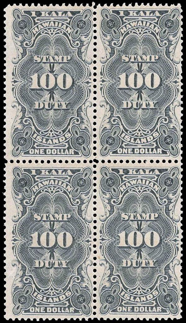 Hawaii, Revenue, 1913, $1 black (Scott R14), block of 4, o.g., hinged, Very Fine. Scott $90. Estimate $75 - 100. Scott $90 Suggested Bid $75-100 (Image)