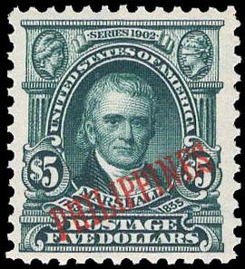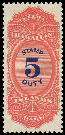 Hawaii, Revenue, 1910, $5 vermilion & violet blue (Scott R15), perfect in every respect, o.g., never hinged, a Superb gem. Scott $55. Estimate $50 - 75. Scott $55 Suggested Bid $50-75 (Image)