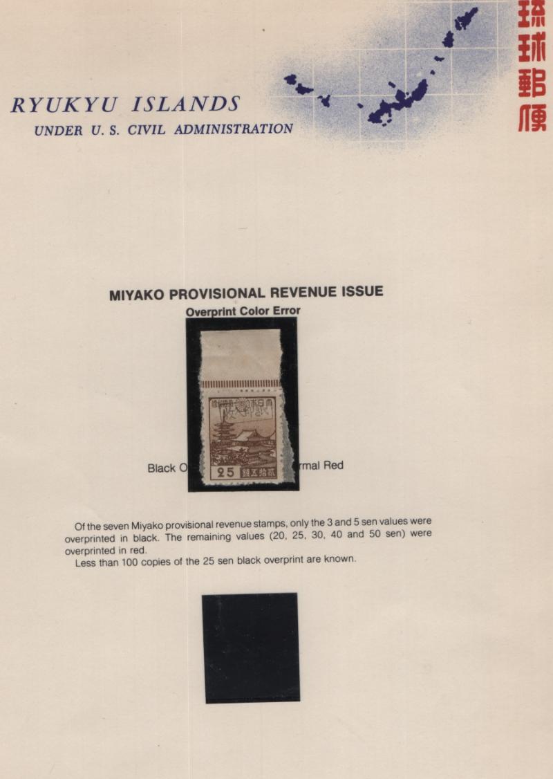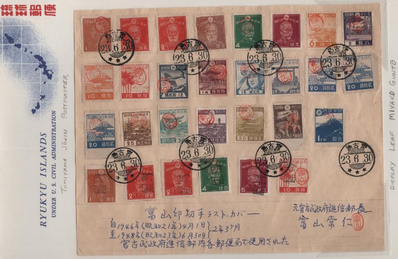 RARE Display sheet produced by postmaster of the Miyako District in 1964, (29) diff Provisionals 3X1 // 3X31 taken from remainder stock & affixed to sheet, all tied by 6/30/23 (1948) backdated cancels reflecting the last day of validity; only six such display sheets are known! (Image)