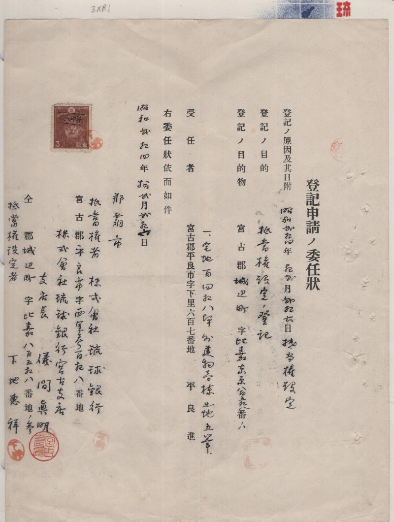 3XR1 F-VF Miyako 3s brown Provisional revenue, tied by chop to document, multiple other seal hs, previously folded & stapled, stamp sound; not valued by Scott, RARE (Image)
