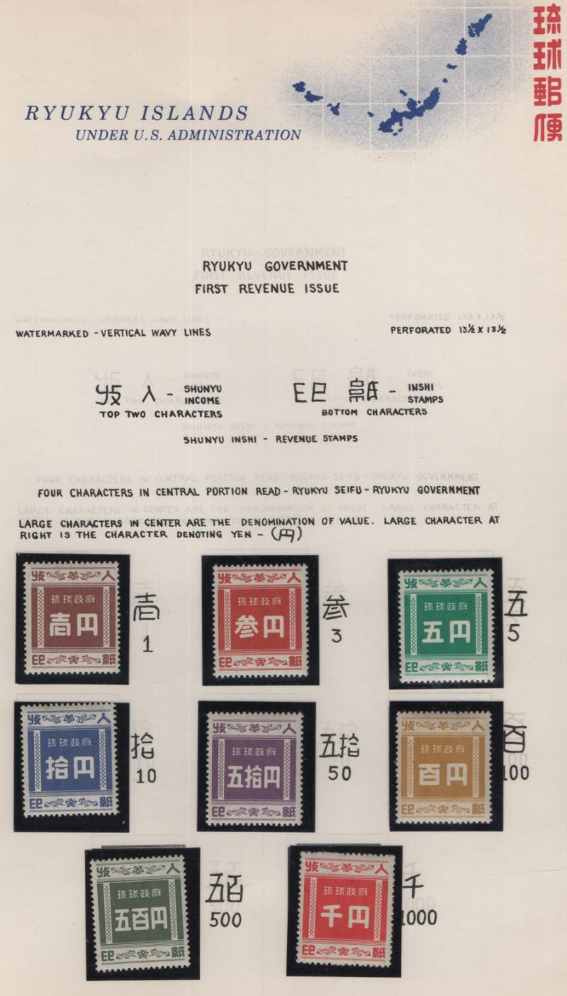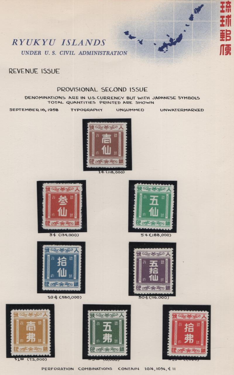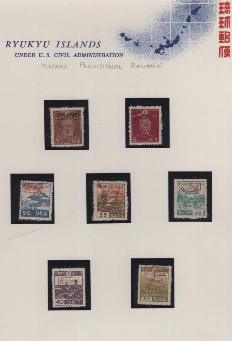 3XR1-3XR7 F-VF+ Complete set of (7) unused Miyako provisional revenues in mounts on Bush album page, 5s & 20s w/o the usual paper backing (Image)