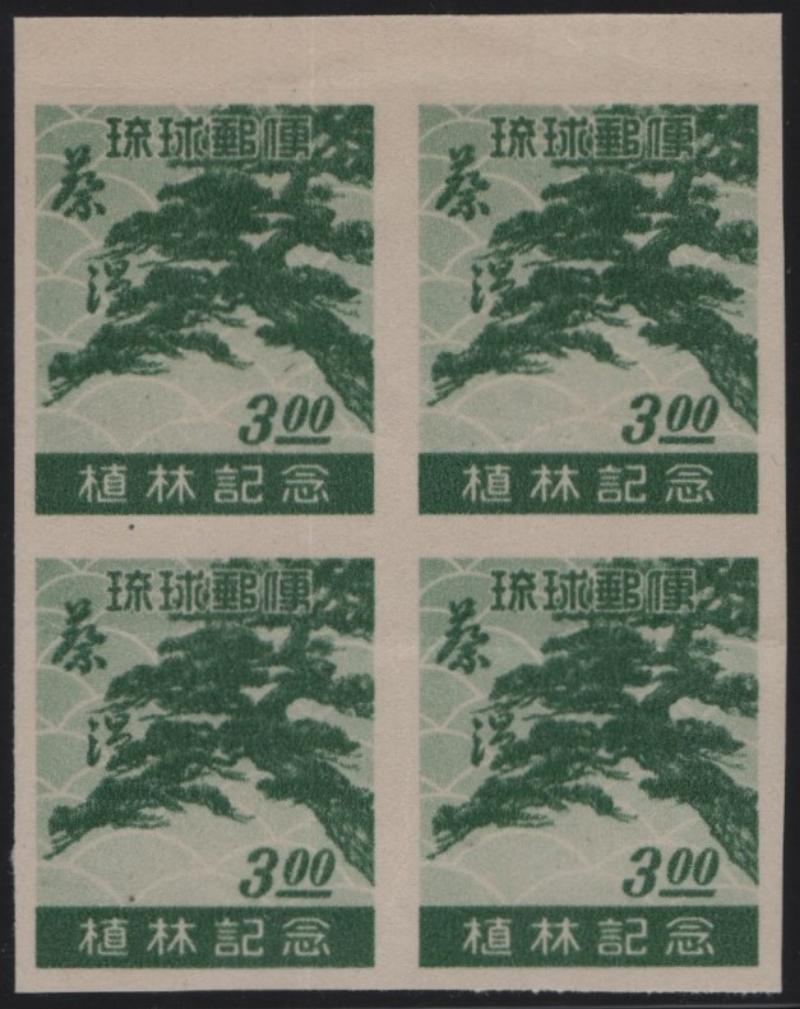 15P5 VF+ Reforestation ¥3 dark green, top margin block, imperf proof on soft white paper, w/o gum, pos. 6-7/16-17, some natural paper wrinkles (Image)