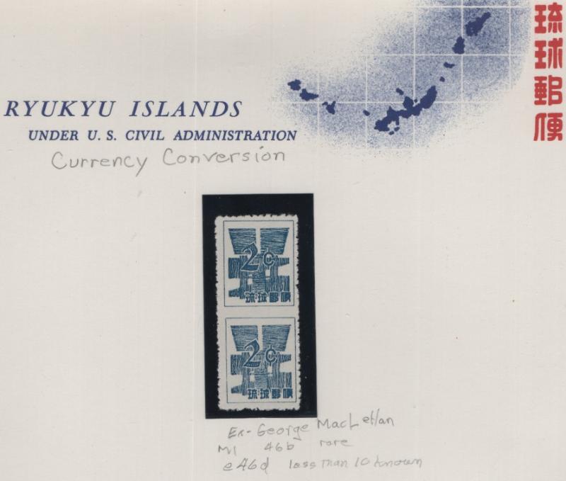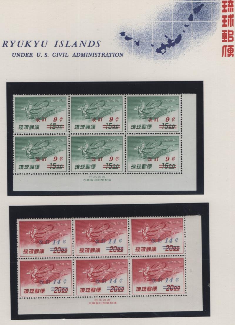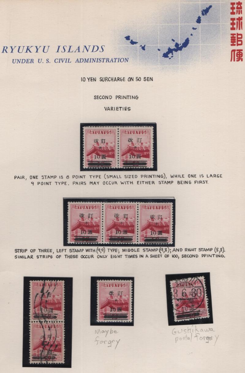 16 Selection of 2nd printing varieties for surcharged ¥10 on 50s, on annotated Bush album page; incl Hz pair left stamp 8/8, right stamp 9/9; Hz strip/3 w/ 9/9, 9/8 & 8/8 (#16e); V used pair Gushikawa forgery (CV $1000); a possible unused forgery & a single used Gushikawa forgery (CV $500); gen F-VF (Image)