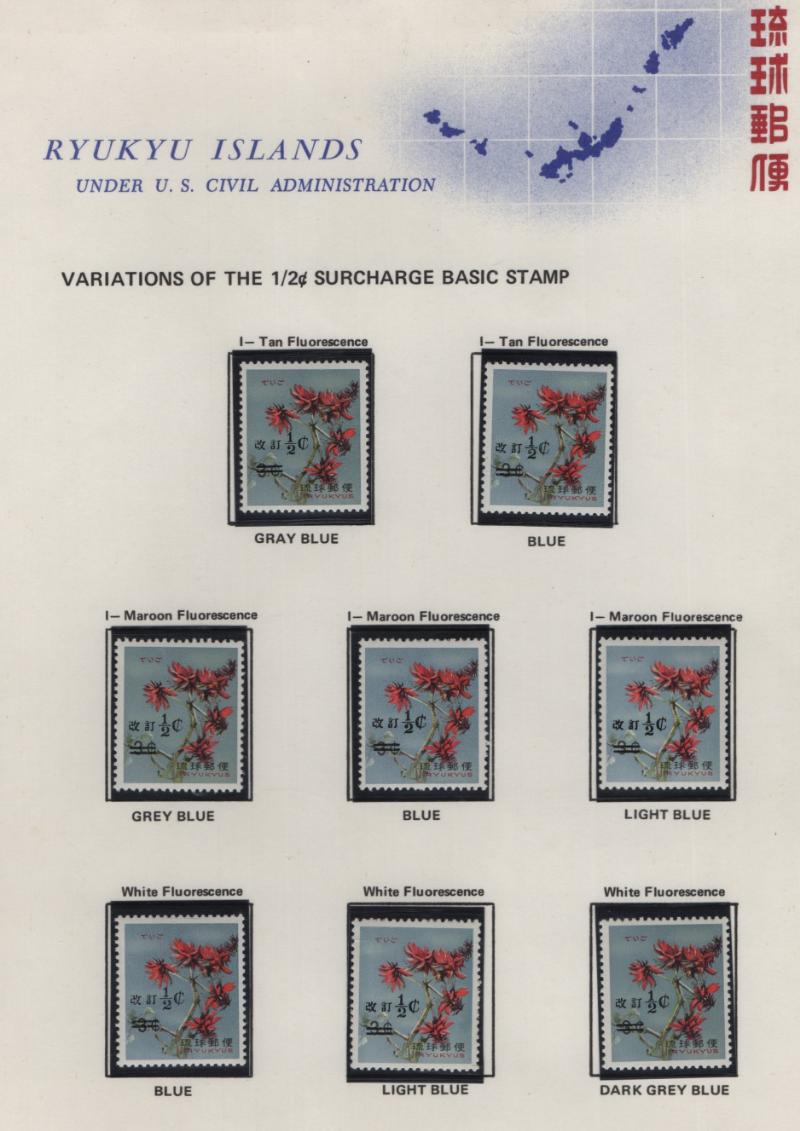 190 VF Specialized Collection of the ½¢ surcharge on 3¢ deigo tree flowers; on Bush album pgs, ea space filled w/ likely NH example of diff shade, paper, fluorescence & Ovpt types; Bush pgs incl Basic 1-3 (24 stamps), Ia-c (17), IIa-d (20) & V-1 white, V-1 maroon, V-3 tan & V-3 white (48 total incl multiples); gen VF (Image)