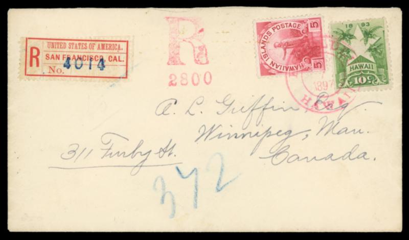 1894, Stars and Palms, 10¢ yellow green. Used with 5¢ rose lake (76), tied together by red "Honolulu, Hawaii, Apr 7, 1897" cds, matching "Registered" R handstamp on cover to Winnipeg, Canada, San Francisco (4.14) transit backstamp and San Francisco registry exchange label (FX-SF1a) affixed, reverse with Victoria (4.18) transit and Winnipeg (4.22) arrival cds, Very Fine. Scott No. 77; Estimate $300 - 400. US$300-400 (Image)