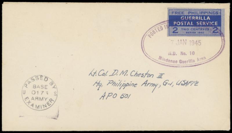 Free Philippines, Guerrilla Postal Service, 1943, 2c blue. Tied by large purple "Posted in the Free Philippines, Mindanao Guerilla Area, 7 Jan, 1945" oval datestamp on cover addressed to APO 501 in Brisbane, Australia, "Passed by Army Examiner, Base 0173" examiner handstamp at lower left, Very Fine, a very rare, Very Fine and rare use of this private WWII military issue. Estimate; $1,000 - 1,500.