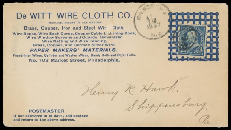 (Manufacturing) DeWitt Wire Cloth Co., Philadelphia Pa. Blue collar type showing grated fence with additional red illustrated "DeWitt" Bicycles advertising on reverse of cover bearing 1¢ blue (264) tied by target duplexed with "Rancocos, N.J. Aug 12, 1897" cds to Shippensburgh Pa., Very Fine. Estimate; $100 - 150. US$100-150 (Image)