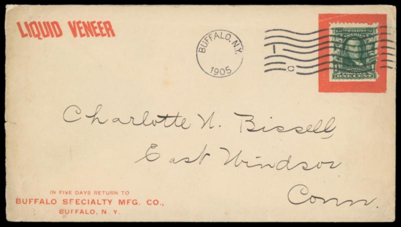 (Manufacturing) "Liquid Veneer" Buffalo Specialty, Mfg. Co. Solid red collar with 1¢ green (300) tied by "Buffalo, N.Y. 1905" machine cancel to East Windsor, Ct.; small stamp flaws, and light cover edge flaws at left still, F.-V.F. Estimate; $50 - 75. US$50-75 (Image)