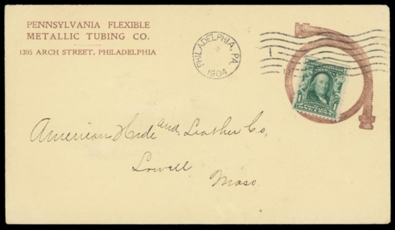(Manufacturing) Pennsylvania Flegible Tubing Co., Philadelphia. Interesting brown illustrated collar of circular metal tubing on cover bearing 1¢ green (300) nat. s.e. tied by "Philadelphia Pa. 1904" machine cancel to Lowell Mass., unusual, Very Fine. Estimate; $100 - 150. US$100-150 (Image)