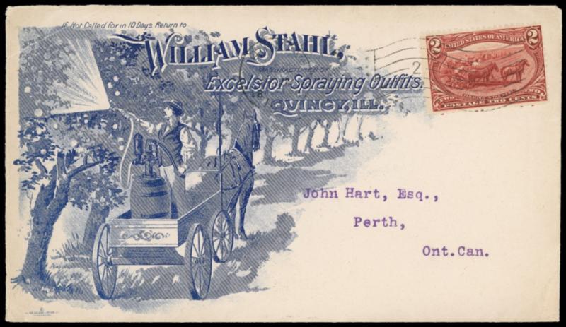 (Manufacturing) William Stahl, Excelsior Spraying Outfits, Quincy Ill. Ornate illustrated advertising design on cover bearing 2¢ Trans-Miss (286) tied by "Quincy, Ill. Jun 22, 1898" flag machine cancel to Perth, Canada, design depicts a man spraying trees from a horse-drawn carriage; light cover corner crease upper right causing small 2¢ flaw, still a Very Fine and outstanding advertising design. Estimate; $200 - 300. US$200-300 (Image)