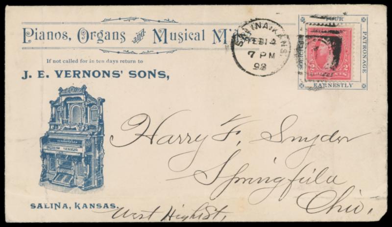 (Music) "Pianos, Organs and M'dse", JE Vernons Sons, Salina, Kansas. Blue advertising collar with additional illustration at lower left on cover bearing 2¢ carmine (267) tied by "Salina Kans. Feb 14, 98" duplex to Springfield, Ohio; small corner nick anl light folds still, F.-V.F. Estimate; $75 - 100. US$75-100 (Image)