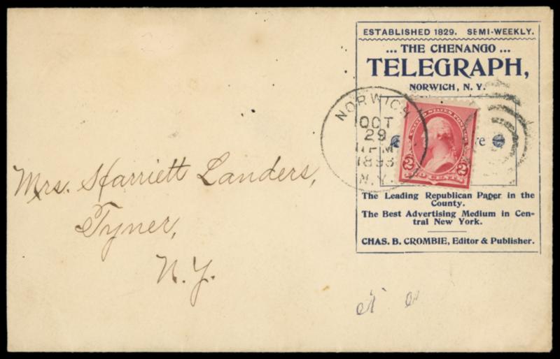 (Newspapers) "The Chenango Telegraph, Norwich, N.Y." . Large advertising collar on cover bearing 2¢ carmine (220) tied by "Norwich, N.Y. Oct 29, 1893" duplex to Tyner N.Y., reduced at left, still Very Fine. Estimate; $75 - 100. US$75-100 (Image)
