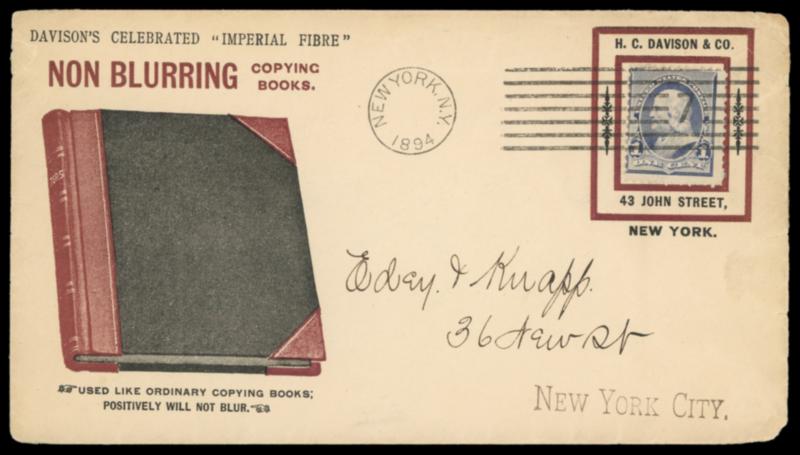 (Paper Supplies) "Non Blurring Copying Books", HC Davidson & Co, New York. Multicolored illustrated advertising and stamp collar on cover bearing 1¢ dull blue (219) tied by "New York, N.Y. 1894" machine cancel to New York City; ever so slightly rounded corner still, Very Fine to Extremely Fine. Estimate; $200 - 300. US$200-300 (Image)