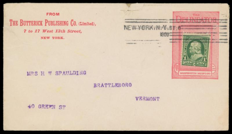 (Printing & Publishing) "The Delineator", Butterick Publishing Co, New York N.Y. Red advertising collar on cover bearing 1¢ green (219) tied by "New York N.Y. St. O, 1900" machine cancel to Brattleboro Vt.; small tear at top from opening still, Very Fine. Estimate; $100 - 150. US$100-150 (Image)