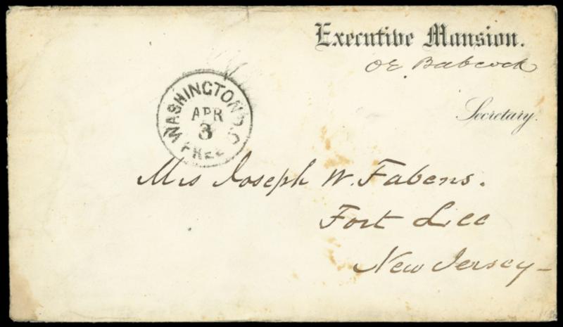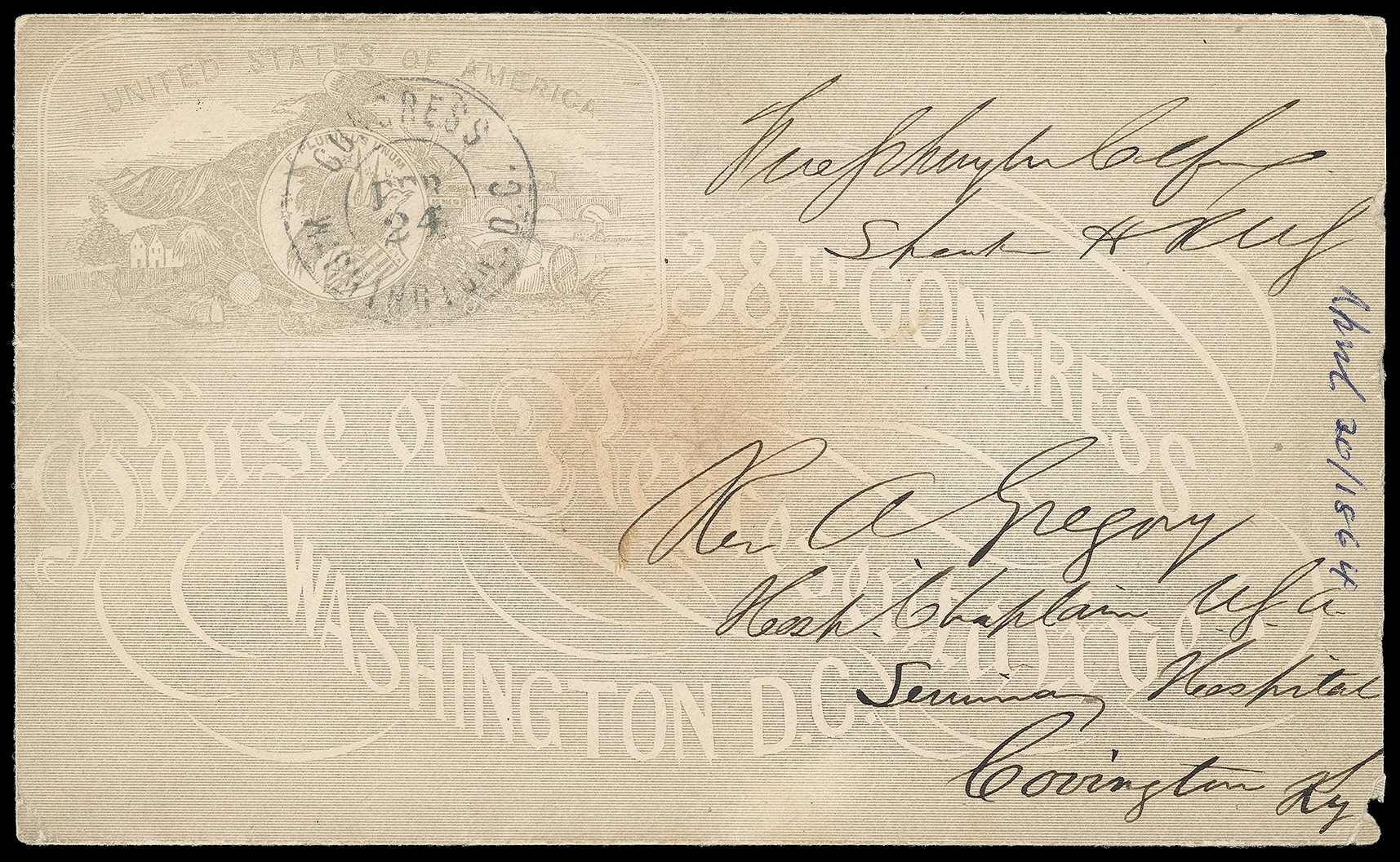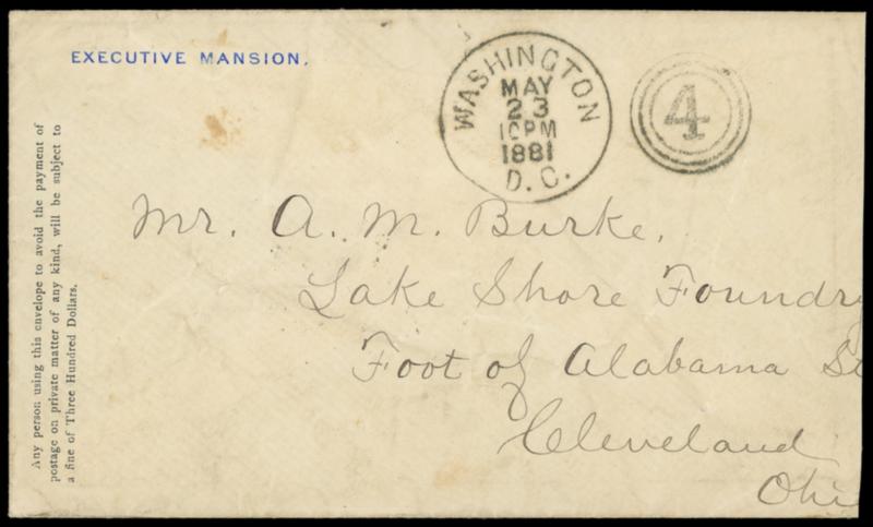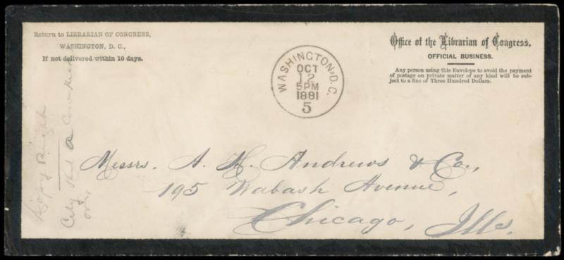 (Interior) Office of the Librarian Congress. Penalty imprint on mourning cover with sharp "Washington, D.C. '5' Oct 12, 1881" cds to Chicago Ill.; some edgewear, Very Fine and scarce Garfield mourning use. Estimate; $300 - 400.
