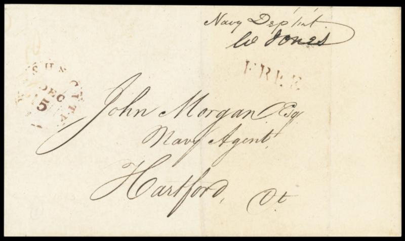(Secretary of the Navy) William Jones.Secretary of the Navy (Jan. 19, 1813 - Dec. 1, 1814). 1813 folded letter with "W Jones" free frank as Secretary of the Navy endorsed "Navy Deptmt" entering mails with "Wash. City, Dec 5" cds and "Free" rating handstamp to Hartford Ct., letter signed by Jones acknowledges $1,000 requisition from Navy agent, Very Fine and scarce Jones free franked as Sec. of the Navy. Estimate; $150 - 200. US$150-200 (Image)