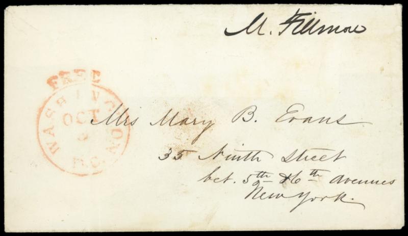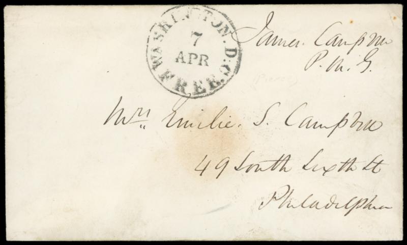 (Postmaster General) James Campbell.Postmaster General 1853-57. Neat "James Campbell, P.N.G." free frank, entered mails with "Washington D.C., Free, 7 Apr" integral cds to his wife in Philadelphia Pa.; light wax seal stain, otherwise Very Fine. Estimate; $150 - 200. US$150-200 (Image)