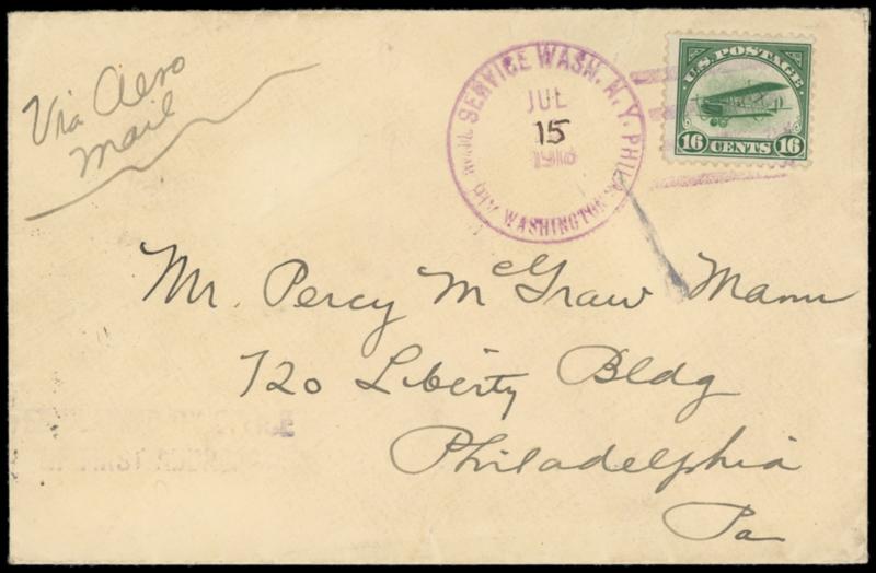 Airmail, 1918, 16¢ green. Tied by purple "Air Mail Service, Wash. N.Y., Phila., Washington, Jul 13, 1918" duplex updated in ms. to "15", on buff cover to Philadelphia Pa. Scott No. C2; $800. US$0 (Image)
