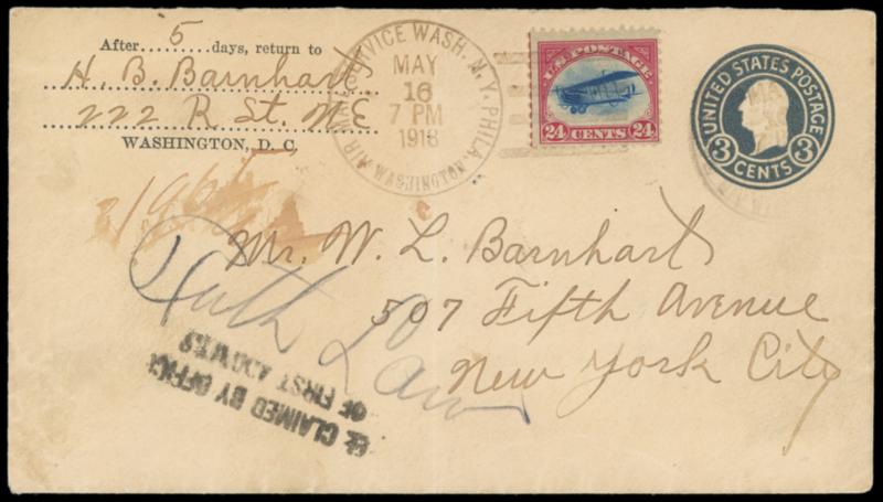 Airmail, 1918, 24¢ carmine rose & blue. Tied by "Air Mail Service Wash. N.y. Phila. 'Washington' May 16, 1918" duplex on 3¢ entire to New York City, autographed by "Ruth Law" noted aviatrix of the day; vertical fold, F.-V.F. use on second day of airmail service. Scott No. C3; Estimate $200 - 300. US$200-300 (Image)