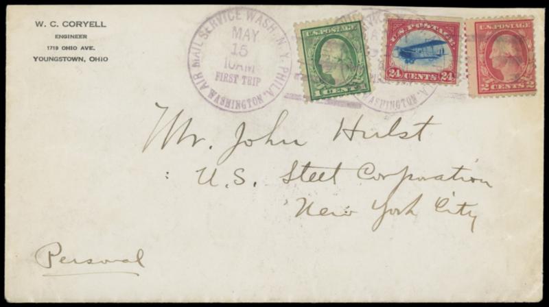 Airmail, 1918, 24¢ carmine rose & blue. Used with 1¢ green (498) and 2¢ carmine (499) tied by purple "Air Mail Service Wash. N.Y. Phila. 'Washington' May 15 10AM First Trip" duplex on first flight cover from Washington D.C. to New York City, F.-V.F. AAMC $500. Scott No. C3; $750.