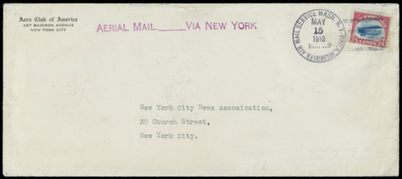 Airmail, 1918, 24¢ carmine rose & blue. Tied by bold "Air Mail Service, Wash. N.Y., Phila., Washington, 'First Trip' May 15, 1918" on legal-size Aero Club of America imprint cover to New York City, purple "Aerial Mail. Via New York" straight cachet; 24¢ small tear, otherwise Very Fine. Scott No. C3; $750.