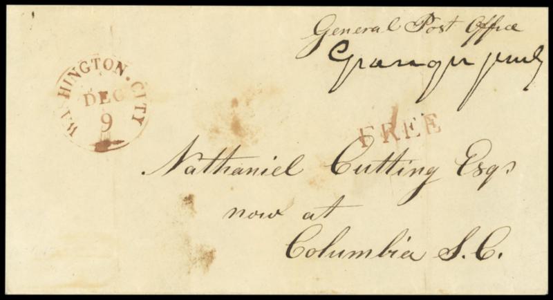 (Postmaster General) Gideon Granger.7th Postmaster General (1801-1814). 1806 folded cover with "Granger PMG" free frank endorsed "General Post Office" entering mails with "Washington. City, Dec 9" cds and "Free" rating handstamp to Columbia S.C., Very Fine. Estimate; $150 - 200. US$150-200 (Image)