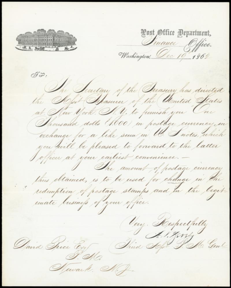 (Post Office) Alexander N. Zevely.Third Assitant Postmaster General 1859-1869. ALS letter signed "A.N. Zevely, Third Asst. P.M. Genl" on Dec. 19, 1862 illustrated Post Office Department letterhead with building vignette to David Price, Postmaster of Newark N.J., regarding having been directed by the Secretary of the Treasury to furnish him with $1000 in postage currency for a like sum in U.S. notes, "The amount of postage currency thus obtained, is to be used for change in the redemption of postage stamps and in the legimitate business of your office.", accompanied by yellow "Post Office Department, Office Business" oval imprint envelope with bold "Washington D.C. Dec 19, 1862" cds to the Postmaster, Newark N.J.; reduced at left, Very Fine and interesting letter in the study of postage currency during the Civil War when there was a shortage of coins for change. Estimate; $200 - 300. US$200-300 (Image)