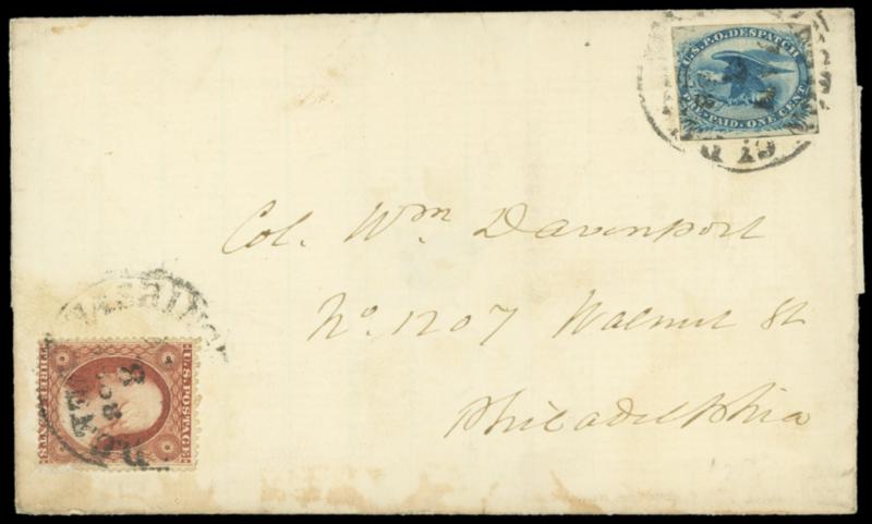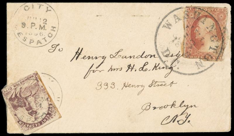 One Cent Despatch, 1856, 1¢ violet. Margins to touched, tied by two partial "City Despatch, Jun 12, 9 P.M., 1856" circular handstamp strikes, additional strike top left, used with 3¢ dull red (11A), margins to in, tied by "Washington D.C., Jul 13, 1856" cds to Brooklyn N.Y.; local with some extra gum, tiny crease from edge placement, Fine and scarce. Scott No. 112L1; $1,500. US$0 (Image)