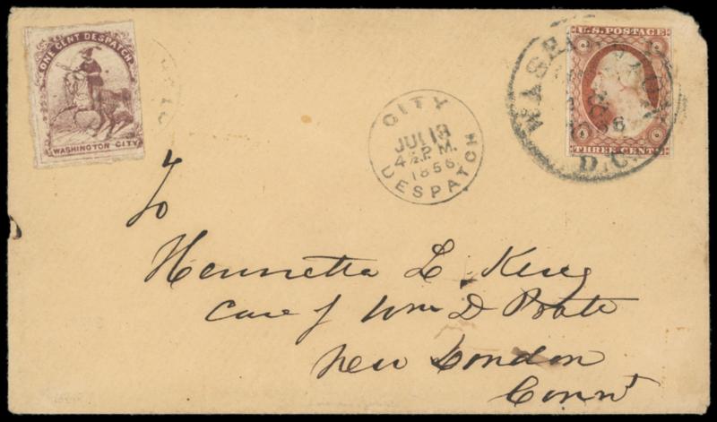 One Cent Despatch, 1856, 1¢ violet. Three large margins, tied by "City Despatch, Jul 18, 4½. P.M., 1856" cds, additional complete strike at center, used with 3¢ dull red (11), three margins, tied by "Washington D.C., Jul 18, 1856" cds on buff cover to New London Conn.; rounded top right cover corner, small nick at left, Very Fine. Scott No. 112L1; $1,500. US$0 (Image)