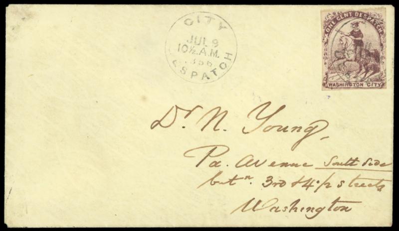 One Cent Despatch, 1856, 1¢ violet. Tied by "City Despatch, Jul 9, 10½. A.M., 1856" cds, additional strike at center on yellow cover to local Washington D.C. street address, Very Fine and scarce local use. Scott No. 112L1; $750. US$0 (Image)