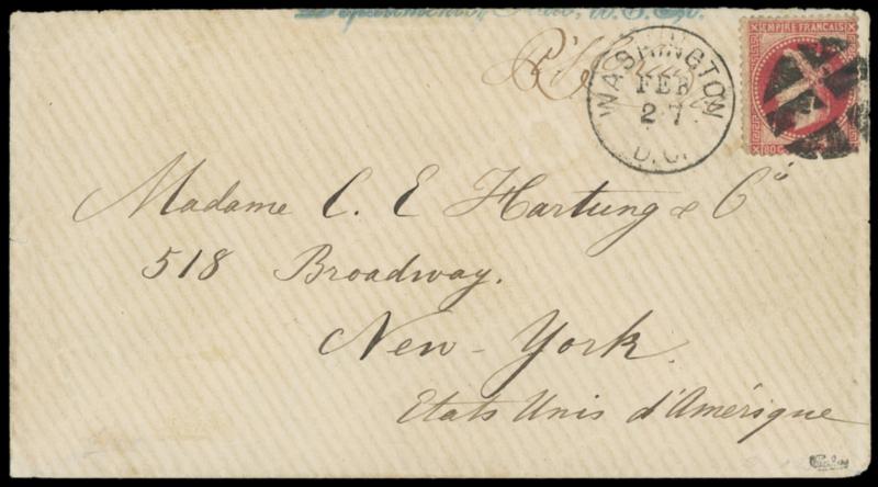 (State) Robert S. Chew.State Department Chief Clerk 1855-73. Free frank "R.S. Chew, C.C." chief clerk signature and partial blue "Department of State, U.S.A." straightline at top edge of incoming cover bearing France, 1867, Napoleon III Laureate, 80c rose on pinkish (36) tied by six-section grid cancel duplexed with "Washington D.C. Feb 27" cds to Hartung & Co., New York N.Y., Very Fine and early diplomatic pouch use. Estimate; $1,500 - 2,000.