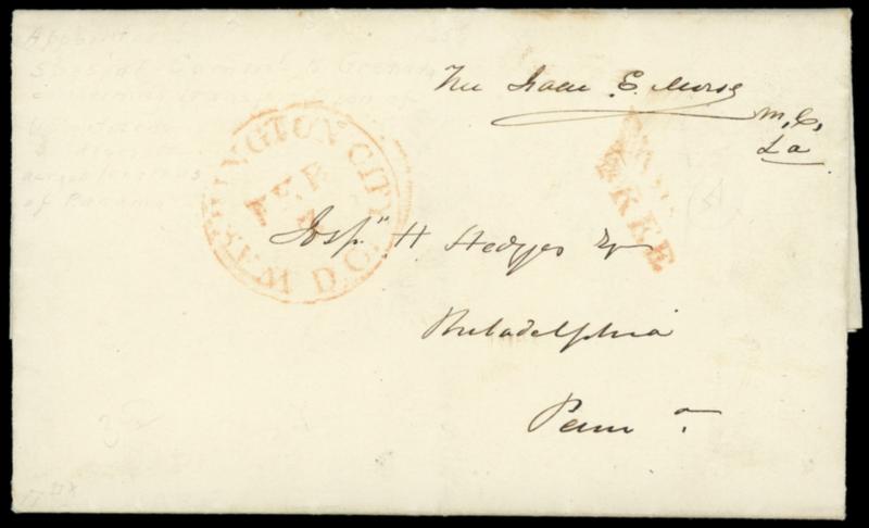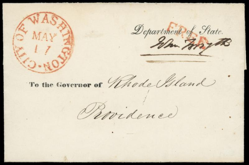(State) John Forsyth.13th Secretary of State 1834-1841. Bold free frank "John Forsyth" signature, entered mails with bold red "City of Washington, May 17" cds and "Free" straightline on Department of State imprint folded cover addressed to the Governor of Rhode Island, an Extremely Fine gem. Estimate; $200 - 300. US$200-300 (Image)