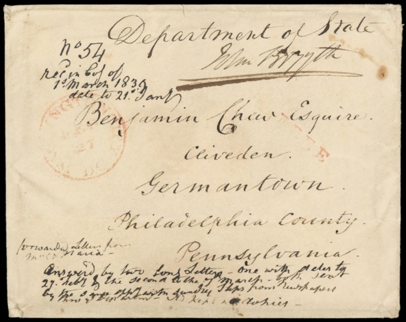 (State) John Forsyth.13th Secretary of State 1834-1841. Cover sent by William W. Chew, U.S. Consul of St. Petersburg, Russia via diplomatic pouch to Washington D.C. where endorsed "Department of State" and free franked "Wm Forsyth" as Secretary of State, entered mails with red "Washington City, D.C., Mar. 27" cds and "Free" handstamp to Benjamin Chew, Germantown Pa., 1839 docketing; horizontal file fold, otherwise Very Fine and scarce. Estimate; $200 - 300.