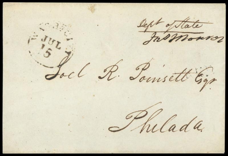 (State) James Monroe.7th Secretary of State 1811-1817. Free frank "Jas Monroe" as Secretary of State on circa 1816 folded cover endorsed "Dept of State", entered mails with "Washn. City Jul 15" cds and light "Free" rating handstamp to Joel R. Poinsett, Philadelphia Pa.; no left flap, Very Fine and choice,ex-Richard Graham. Estimate; $750 - 1,000.