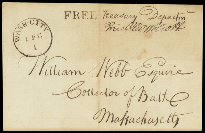 (Secretary of the Treasury) Oliver Wolcott. Free frank "Free Oliv. Wolcott" as Secretary of the Treasury on 1800 folded letter with "Wash. City, Dec 1" bold cds and matching "FREE" rating handstamp to Customs Collector at Bath, District of Massachusetts; file fold, some toning, F.-V.F. Estimate; $150 - 200.