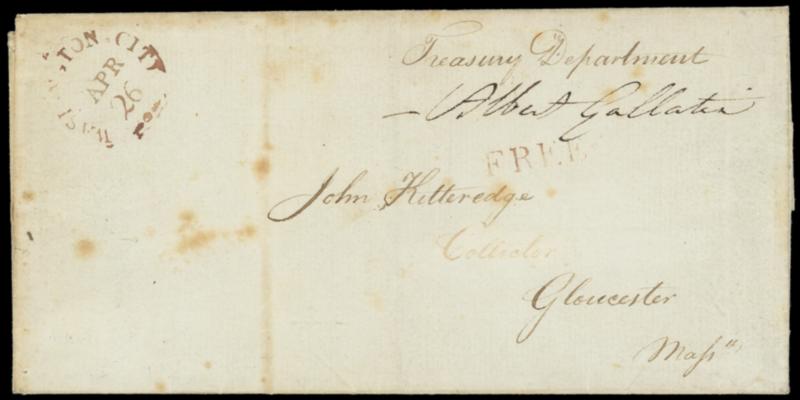 (Secretary of the Treasury) Albert Gallatin. 4th Secretary of the Treasury (1801-1814). Folded cover free franked "Albert Gallatin" and endorsed "Treasury Department at top right, entered mails with "Washington City, Apr 26" cds and matching "Free" handstamp to Customs Collector, Gloucester Mass., endorsed "Circular, from the Secy. of the Treasury Information that a 3d. supplementary Embargo act…April 26. 1808"; some mild tone spotting, Very Fine. Estimate; $150 - 200. US$150-200 (Image)