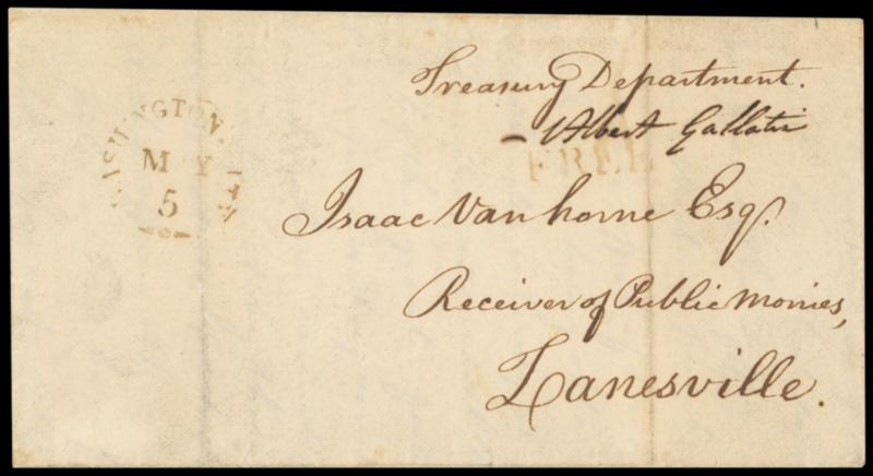 (Secretary of the Treasury) Albert Gallatin. 1808 folded letter free franked "Albert Gallatin" and endorsed "Treasury Department at top right, entered mails with "Washington City, May 5" cds and matching "Free" handstamp to Receiver of Public Monies, Zanesville, Ohio, handwritten dated circular concerning the abuse by companies formed to purchase public lands; leafs split, Fine,ex-Parker. Estimate; $200 - 300. US$200-300 (Image)
