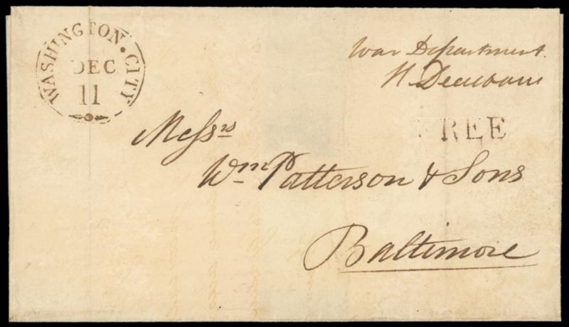 (Secretary of War) Henry Dearborn.Secretary of War (1801-1809). 1807 folded cover with "War Department, H Dearborn" free frank entering mails with sharp "Washington. City, Dec 11" cds and "Free" rating handstamp to Columbia S.C.; file folds, Very Fine. Estimate; $200 - 300. US$200-300 (Image)