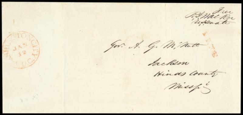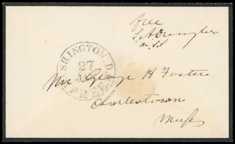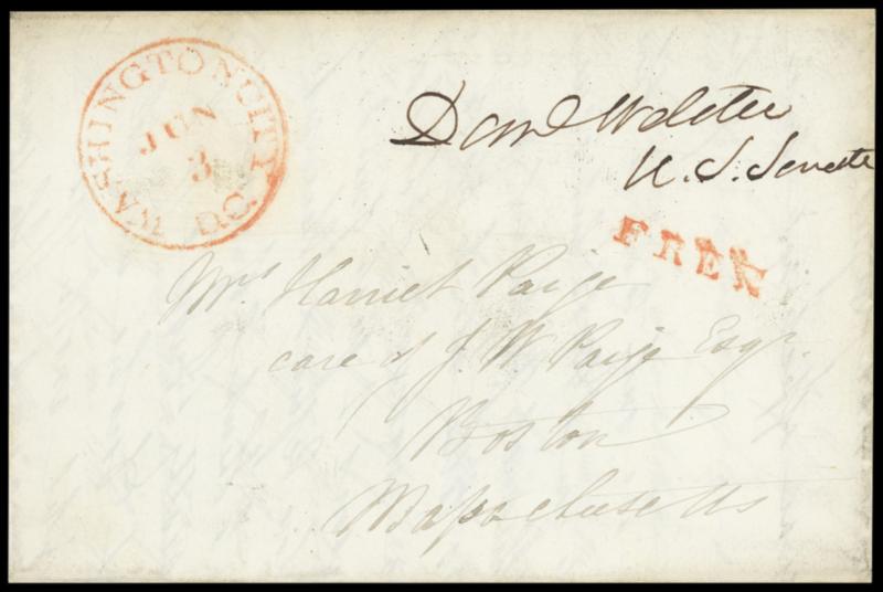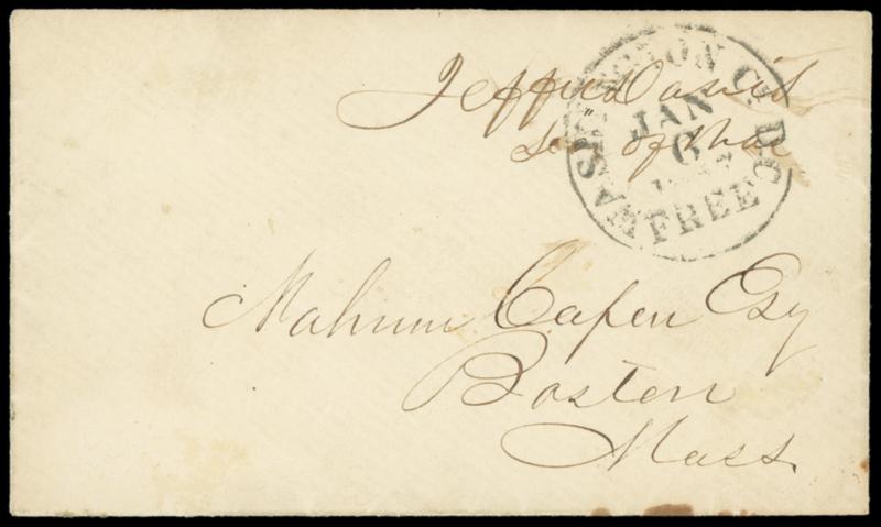 (War) Jefferson Davis.President of the Confederacy. Clear "Jefferson Davis, Sec of War" free frank as Secretary of War at top of cover with "Washington Cy. D.C. 'Free' Jan 6, 1857" integral cds to Boston, Mass.; minor edge toning at bottom, Very Fine,ex-Antrim. Estimate; $500 - 750.