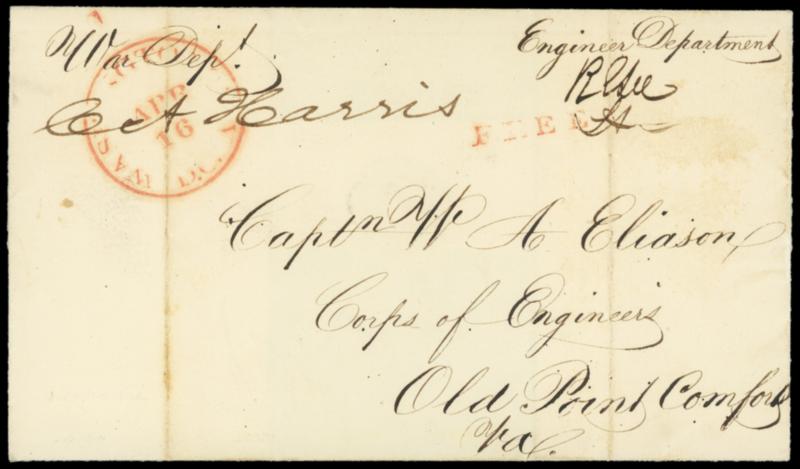 (War) Robert E. Lee. Bold signature "R E Lee" on folded cover headed "War Dept.", entered mails with red "Washington D.C. Apr. 16" cds and matching "FREE" straightline to Captain William A. Eliason, Corps of Engineers at Old Point Comfort Va., manuscript "Engineer Department" in a different hand at top and another military endorsement from a Capt. Harris, April 15, 1837 docketing on back states that the letter was from "Lieut. R. E. Lee" and was an acknowledgement of his receipt of powers of attorney for the first quarter of 1837; slightly toned file folds are inconsequential, Very Fine,ex-Creighton C. Hart, Ambassador Middendorf, David Bernstein. Estimate; $3,000 - 4,000.