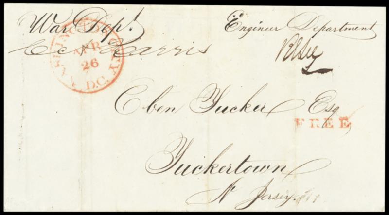 (War) Robert E. Lee. Signature "R E Lee" as member of the Corps of Engineers under "Engineer Department" endorsement, entered mails with red "Washington City D.C. Apr 26" cds and matching "FREE" handstamp on 1837 folded cover to Tuckertown N.J., cover addressed and endorsed in a different hand "War Dept." and signed at top left; light file folds affect signature, Very Fine,ex-Dr. Robertson. Estimate; $3,000 - 4,000.