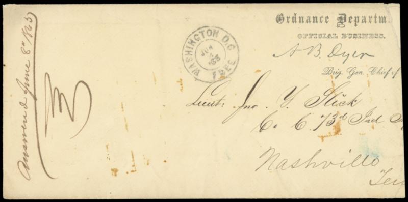 (War) Alexander Byrdie Dyer. 1815-1874. Ordnance Department imprint with printed "A.B. Dyer" free frank on buff cover with "Washington D.C., Free, Jun 2 '65" cds to Nashville Tenn., reverse with overall drawing in blue and black with maze home; reduced slightly at right, F.-V.F. Estimate; $150 - 200.