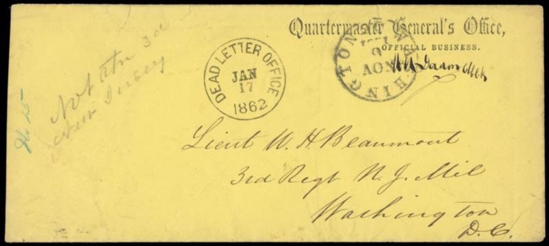 1861 (Nov. 6) Washington D.C. to local address, forwarded to Dead Letter Office. Legal-size Quartermaster General's Office free franked envelope with "Washington D.C. Nov 6, 1861" cds addressed to Lieut. W.H. Beaumont, 3rd Regt N.J. Mil., Washington D.C., pencil "Not at 3d New Jersey" note, bold "Dead Letter Office, Jan 17, 1862" cds, docketed "Property account examined and sent to 3d auditor for settlement" on reverse; top edge tears, Very Fine,ex-Turner. Estimate; $150 - 200. US$150-200 (Image)