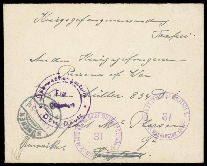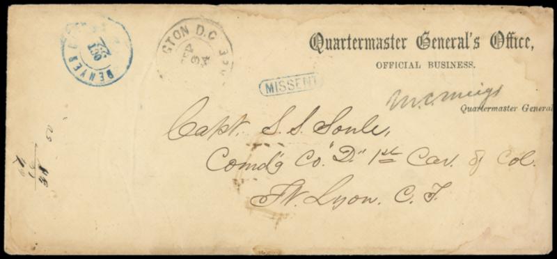 (War) Montgomery C. Meigs. Free frank handstamp, entered mails with partial "Washington D.C 'Free' Sep 3 '64" cds on Quartermaster General's Office imprint cover to Capt. S.S. Soule, Comd'g Co. "D", 1st Cav. of Col, Fort Lyon, Colorado Territory, blue "Denver City, Oct 22" cds with matching "Missent" framed handstamp; slight stains, reduced slightly at right, F.-V.F. and scarce Denver missent use. Estimate; $150 - 200.